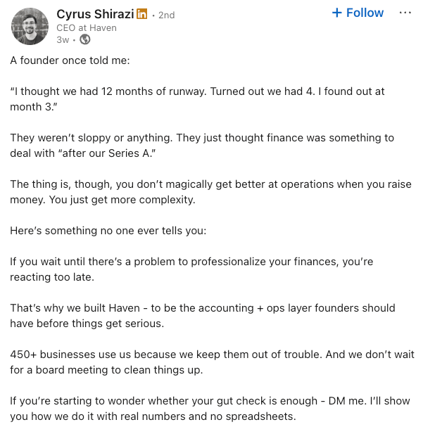 Most founders are overestimating their runway by 3–6 months. Your spreadsheet isn’t your savior. Your historicals are. Track weekly, not quarterly. And don’t wait for the board meeting to find out you’re in trouble.